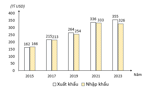 Biểu đồ trị giá xuất và nhập khẩu hàng hóa của nước ta giai đoạn 2015 - 2023