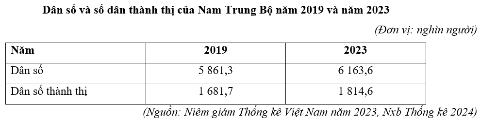 Căn cứ vào bảng số liệu trên, hãy cho biết tỉ lệ dân thành thị của Nam Trung Bộ năm 2023 so với năm 2019 tăng bao nhiêu phần trăm (làm tròn kết quả đến hai chữ số thập phân).