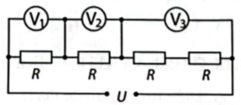 Cho mạch điện như hình vẽ. Hiệu điện thế U = 12 V, điện trở các dây nối không đáng kể. Các vôn kế đều lí tưởng (điện trở của vôn kế là vô cùng lớn). Tìm số chỉ các vôn kế?