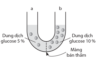 Các dung dịch trong hai nhánh của ống chữ U này được ngăn cách bởi một lớp màng bán thấm, có tính thấm nước nhưng không thấm glucose. Nhánh a của ống chứa dung dịch glucose 5 %. Nhánh b của ống chứa dung dịch glucose 10 %. Ban đầu, mức dung dịch ở cả hai bên ngang bằng nhau. Sau khi hệ thống đạt đến trạng thái cân bằng, sự thay đổi nào dưới đây có thể quan sát được?