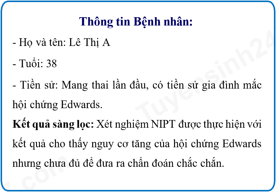 Hình bên mô tả tóm tắt bệnh án của một sản phụ đang ở tuần thai thứ 17. Trong tình huống của bệnh nhân Lê Thị A, với các dấu hiệu sớm về rủi ro hội chứng Edwards và thai kỳ đang ở tuần 17, phương pháp chẩn đoán trước sinh xâm lấn nào sau đây là phù hợp nhất để xác định chẩn đoán một cách chính xác?