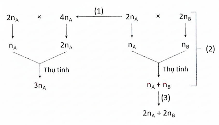 | b) Loài 4nA và loài 3nA được hình thành bằng con đường tự đa bội, loài (2nA + 2nB) được hình thành bằng con đường dị đa bội. | ||