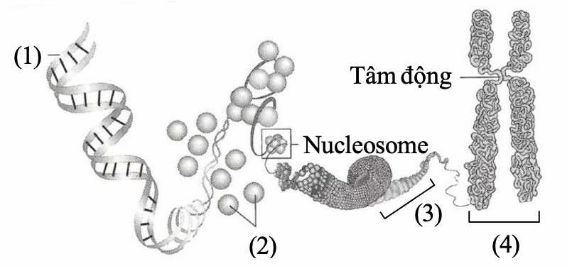 Hình bên dưới mô tả cấu trúc siêu hiển vi của nhiễm sắc thể trong tế bào người với bốn vị trí được kí hiệu là (1), (2), (3) và (4).