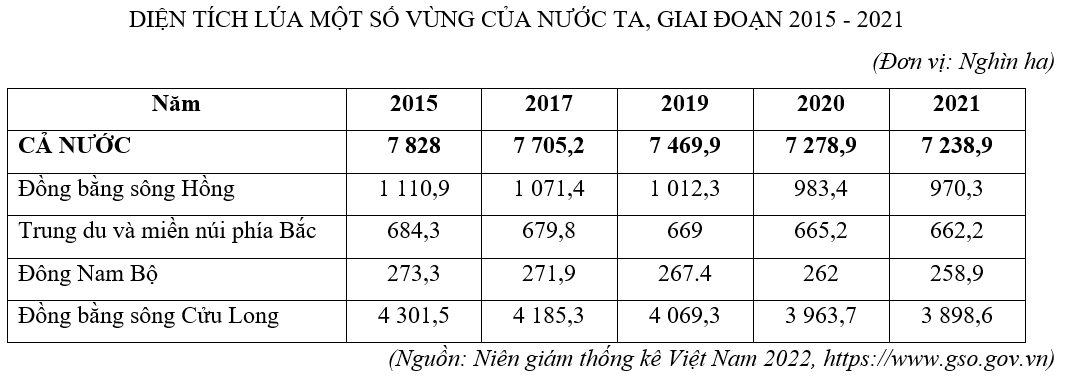 | c) Tỉ trọng diện tích lúa ở Đồng bằng sông Cửu Long năm 2021 giảm 1,3% so với năm 2015. | ||
