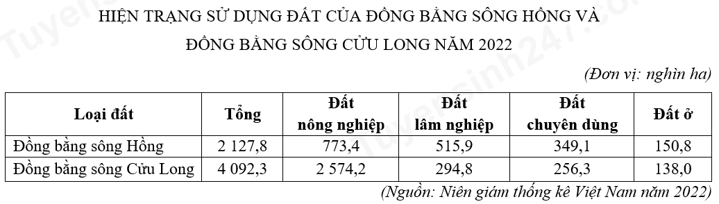 Dựa vào bảng số liệu và so sánh về diện tích các loại đất của Đồng bằng sông Hồng và Đồng bằng sông Cửu Long. Lựa chọn nhận xét đúng.