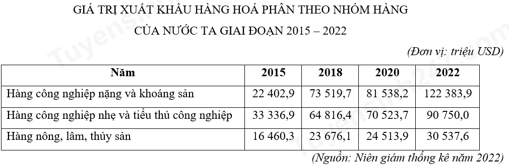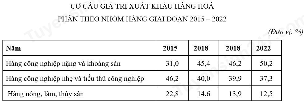 Dựa vào bảng số liệu, hãy nhận xét và giải thích về giá trị và cơ cấu giá trị xuất khẩu hàng hoá phân theo nhóm hàng của nước ta giai đoạn 2015 – 2022.