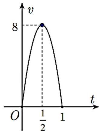 Một vật chuyển động trong 1 giờ với vận tốc $v$ phụ thuộc vào thời gian $t$ có đồ thị vận tốc như hình bên. Trong khoảng thời gian 1 giờ kể từ khi bắt đầu chuyển động, đồ thị đó là một phần của đường parabol có đỉnh $I\left( {\dfrac{1}{2};8} \right)$ và trục đối xứng song song với trục tung. Tính gia tốc của vật lúc $t = 0,25(h)$