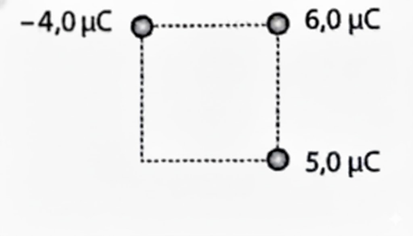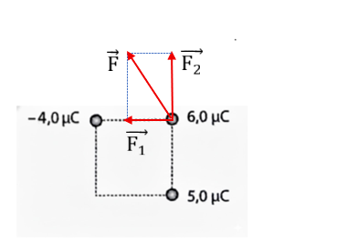 Ba điện tích được đặt ở ba đỉnh của một hình vuông có cạnh là 20 cm. Tìm hợp lực do điện tích $- 4,0\mu C$ và điện tích $5,0\mu C$ tác dụng lên điện tích $6\mu C$. (Kết quả làm tròn đến chữ số thập phân thứ hai)