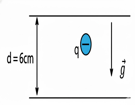 Trong vùng không gian giữa hai tấm kim loại phẳng, tích điện trái dấu nhau và cách nhau một đoạn $d = 6\, cm$ có một hạt bụi kim loại tích điện âm, khối lượng $m = 3.10^{- 6}g$ đang lơ lửng tại vị trí cách đều hai tấm kim loại như hình. Biết rằng hiệu điện thế giữa hai tấm kim loại khi đó là $U = 1000\, V$. Nếu hiệu điện điện thế đột ngột giảm đến giá trị $U = 800\, V$, Sau bao lâu thì hạt bụi này chạm đến một trong hai tấm kim loại nói trên? Lấy $g = 10\, m/s^{2}$(Kết quả làm tròn đến chữ số thập phân thứ hai)