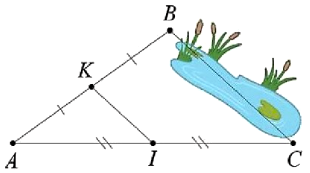 Biết \(K I=25 \mathrm{~m}\) và K là trung điểm của AB, I là trung điểm của AC. Xác định độ dài của BC mà không cần phải di chuyển qua hồ nước theo đơn vị mét.