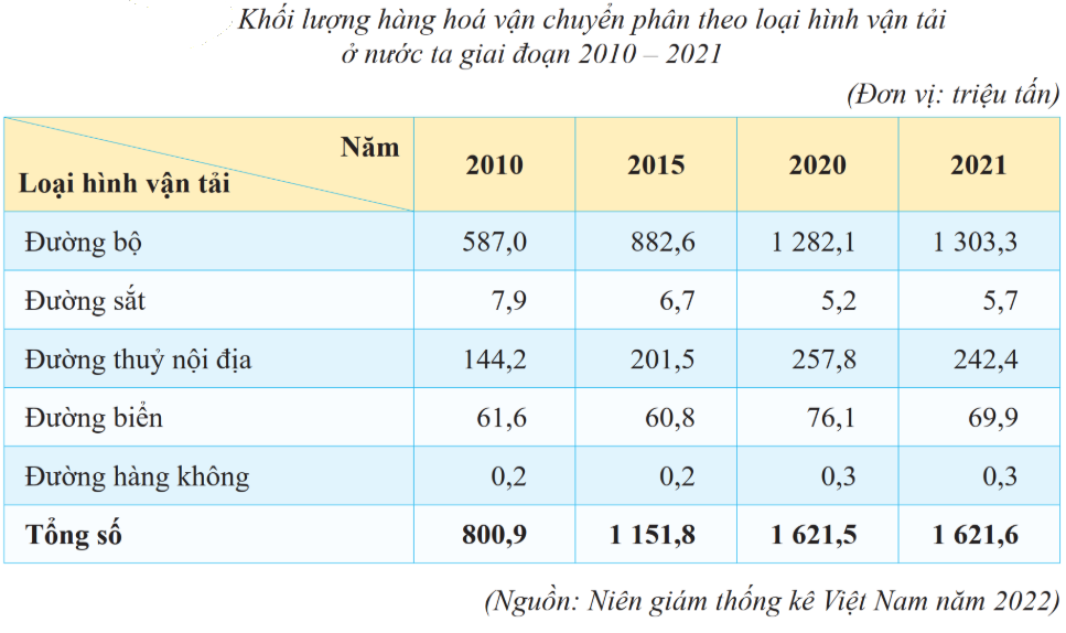 Dựa vào bảng số liệu và nhận xét về sự thay đổi khối lượng hàng hóa vận chuyển của nước ta giai đoạn 2010 - 2021.
