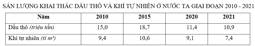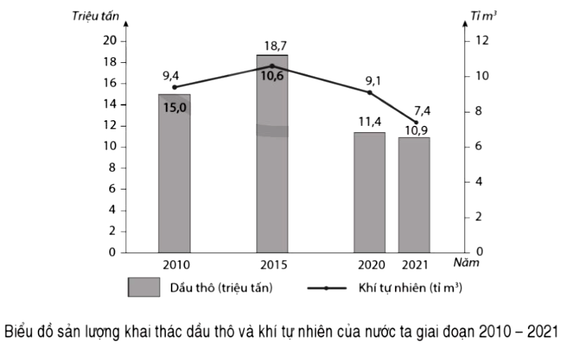 a. Vẽ biểu đồ kết hợp (cột và đường) thể hiện sản lượng khai thác dầu thô và khí tự nhiên của nước ta giai đoạn 2010 - 2021.