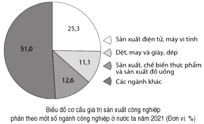 “Năm 2021, ngành công nghiệp sản xuất điện tử, máy vi tính chiếm 25,3%; công nghiệp dệt, may và giày, dép chiếm 11,1%; công nghiệp sản xuất, chế biến thực phẩm và sản xuất đồ uống chiếm 12,6% giá trị sản xuất công nghiệp của cả nước. Đây là một số ngành công nghiệp đóng góp tỉ trọng cao trong tổng giá trị sản xuất toàn ngành công nghiệp, thúc đẩy sự phát triển kinh tế – xã hội của đất nước".