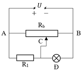 1) Cho mạch điện có sơ đồ như hình bên. Trong đó, hiệu điện thế U=10,8 V luôn không đổi, R1=12 Ω, đèn Đ ghi 6V – 6W. Biến trở là một dây dẫn đồng chất, tiết diện đều, có điện trở toàn phần $R_{b} = 36$ $\Omega$. Coi điện trở của đèn không đổi, điện trở của dây nối không đáng kể.