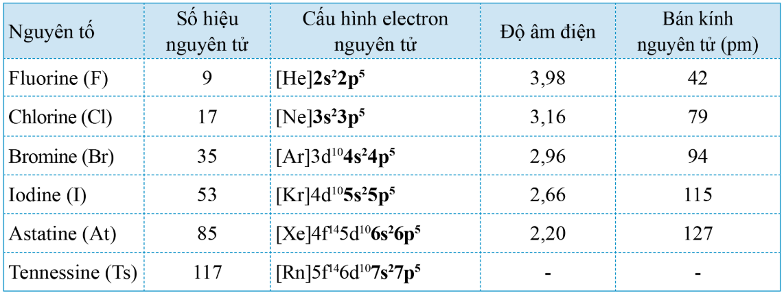 Bảng 1. Một số đặc điểm các nguyên tố halogen