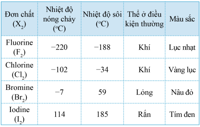 Dựa vào bảng số liệu, xác định các đơn chất halogen tồn tại trạng thái khí.