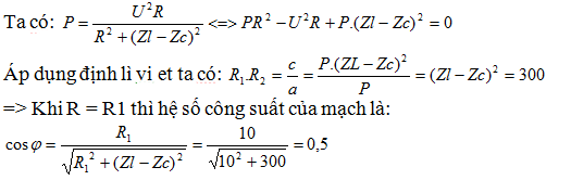 Một mạch RLC nối tiếp có R thay đổi được . Khi cho R = R1 = 10 Ω hoặc R = R2 = 30 Ω thì công của mạch như nhau. Hệ số công suất của mạch khi R = R1 bằng