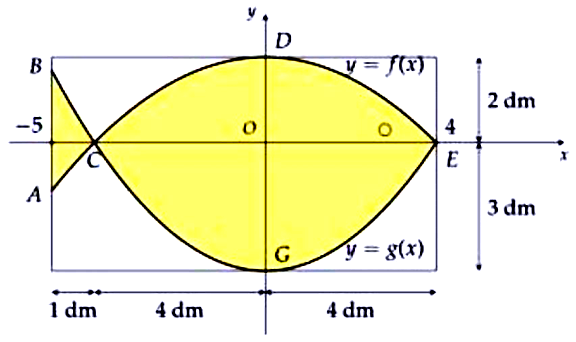 Trên cửa sổ có dạng hình chữ nhật của ngôi nhà một doanh nghiệp kinh doanh hải sản, họa sĩ cần thiết kế logo hình con cá. Logo là hình phẳng giới hạn bởi hai parabol với các kích thước được cho trong hình bên (đơn vị trên mỗi trục tọa độ là dm). Hoạ sĩ cần tính diện tích của logo để báo giá cho doanh nghiệp đó trước khi kí hợp đồng. Diện tích của logo bằng $Xdm^{2}$. Tìm $x$ (làm tròn kết quả đến hàng đơn vị).