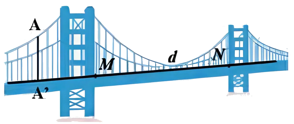 Một mô hình cầu treo được thiết kế trong không gian tọa độ $Oxyz$ như hình vẽ. Làn đường $d$ đi qua hai điểm $M\left( {4;3;1} \right)$ và $N\left( {5;7;3} \right)$. Từ một điểm $A\left( {5;2;1} \right)$ trên cáp treo, người ta cần tìm tọa độ điểm $A'\left( {a;b;c} \right)$ là hình chiếu vuông góc của $A$ trên $d$ để lắp đặt đai chịu lực nâng cho cầu. Tính giá trị của $a + b + c$.