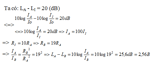 một nguồn âm đặt tạo O phát sóng đẳng hướng trong không gian . A và B là 2 điểm nawmfd trân cùng 1 tia xuất phát từ O.I là trung điểm của AB . Gọi LA , LI, LB Lần lượt là mức cường độ âm tại A, I, B ta có LA-LI = 20 (bB)