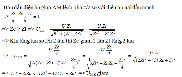đoạn mạch AB nối tiếp theo thứ tự gồm điện trở thuần , cuộn dây thuần cảm và tụ điện có thể thay đổi điện dung . Điểm M nằm giữa cuộn dây va tụ . Điện áp hai đầu mạch là u = 200cos(2 πft) (V) . Ban đầu điện áp giữa AM lệch AM lệch pha π/2 so với điện áp hai đầu mạch . Tăng tần số của dòng điện lên 2 lần thì điện áp giữa MB