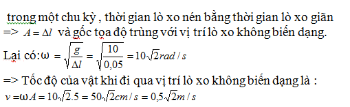 khi con lắc lò xo thẳng đứng ở vị trí cân bằng thì lò xo dãn 5 cm .Lấy g =10m/s2 .Biết rằng trong một chu kỳ , thời gian lò xo nén bằng thời gian lò xo giãn .Tốc độ của vật khi đi qua vị trí lò xo không biến dạng là :