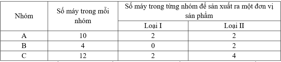 Có ba nhóm máy A, B,C dùng để sản xuất ra hai loại sản phẩm I và II. Để sản xuất một đơn vị sản phẩm mỗi loại phải lần lượt dùng các máy thuộc các nhóm khác nhau. Số máy trong một nhóm và số máy của từng nhóm cần thiết để sản xuất ra một đơn vị sản phẩm thuộc mỗi loại được cho trong bảng sau: