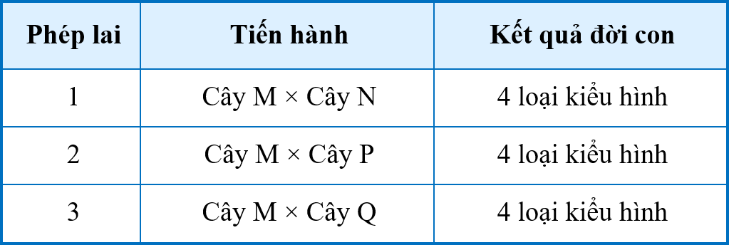 Ở một loài thực vật lưỡng tính, xét hai cặp gene phân li độc lập (gồm các allele tương ứng là A, a và B, b), trong đó mỗi gene quy định một tính trạng và allele trội là trội hoàn toàn. Khi lai cây M lần lượt với các cây N, P, Q người ta thu được kết quả như bảng sau (biết rằng M, N, P, Q có kiểu hình khác nhau):