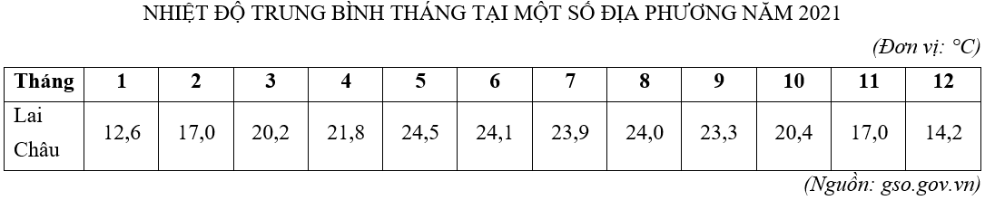 Căn cứ vào bảng số liệu, em hãy tính biên độ nhiệt độ trung bình năm của Lai Châu (Làm tròn kết quả đến số thập phân thứ nhất)