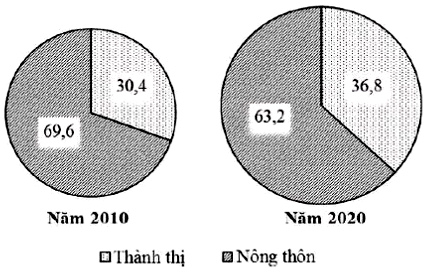 Cho biểu đồ về dân số nước ta phân theo thành thị và nông thôn nước ta năm 2010 và 2020.