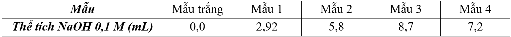 - Sau thời gian ủ, thể tích dung dịch các mẫu gần như không đổi. Mỗi mẫu được lấy 5 mL, pha loãng đến 100 mL, sau đó tiến hành chuẩn độ bằng dung dịch NaOH 0,1 M với chỉ thị phenolphthalein. Kết quả thu được như bảng sau: