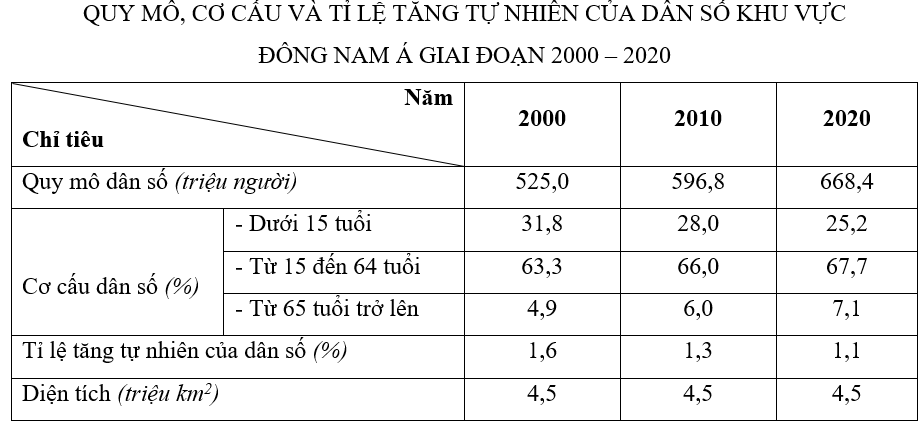 | a) Đông Nam Á có quy mô dân số đông, chiếm 15% dân số thế giới, tạo nên nguồn lao động dồi dào, thị trường tiêu thụ rộng lớn. | ||