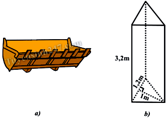Gàu xúc của một xe xúc (Hình a) có dạng gần như một hình lăng trụ đứng tam giác với các kích thước đã cho ở hình b). Để xúc hết \(40{m^3}\) cát, xe phải xúc ít nhất bao nhiêu gàu?