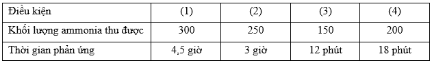 Người ta tổng hợp ammonia theo các điều kiện nhiệt độ, xúc tác khác nhau. Đo khối lượng ammonia trong các khoảng thời gian được kết quả ở bảng sau: