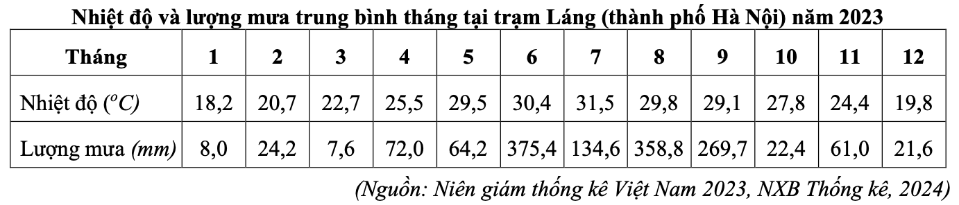 | d) Biểu đồ kết hợp là dạng thích hợp nhất để thể hiện nhiệt độ và lượng mưa trung bình các tháng của trạm Láng năm 2023. |