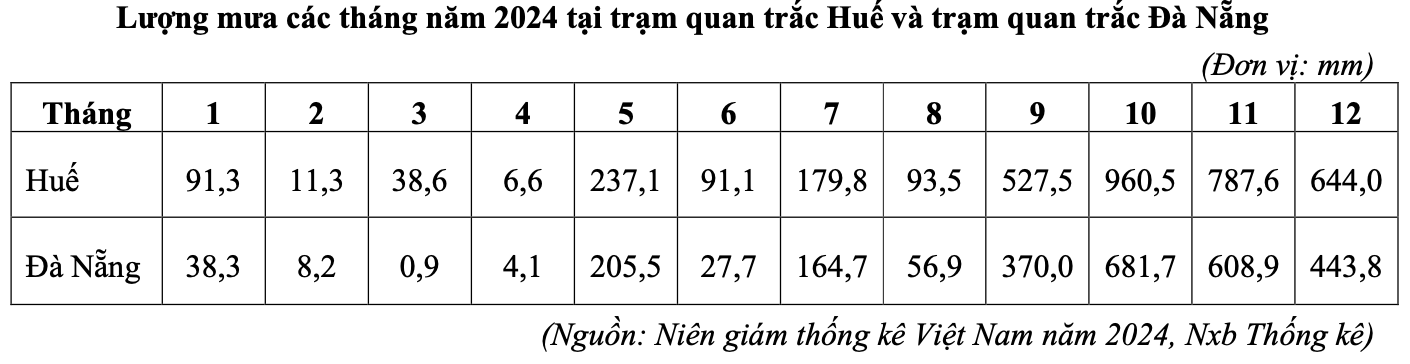Căn cứ vào bảng số liệu trên, hãy cho biết lượng mưa của tháng có lượng mưa nhỏ nhất tại trạm quan trắc Huế cao hơn lượng mưa của tháng có lượng mưa nhỏ nhất tại trạm quan trắc Đà Nẵng năm 2024 là bao nhiêu mm (làm tròn kết quả đến một chữ số thập phân).