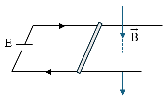 Hai thanh ray nằm ngang, song song và cách nhau 10cm, đặt trong từ trường đều có các đường sức từ thẳng đứng hướng xuống và độ lớn cảm ứng từ B = 0,1T. Một thanh kim loại đặt trên ray, hai đầu tiếp xúc điện và vuông góc với 2 thanh ray. Nối 2 thanh ray với nguồn điện $E = 12V;r = 1\Omega$. Biết điện trở của phần mạch điện kín gồm thanh kim loại, 2 thanh ray và dây nối là $R = 5\Omega$. Bỏ qua ma sát. Ban đầu giữ cho thanh chưa chuyển động