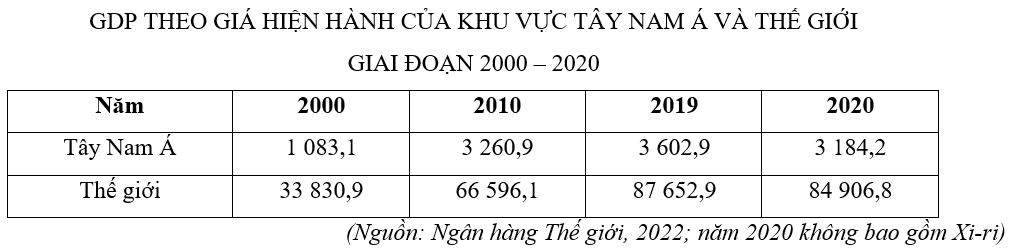 Cho bảng số liệu:Dựa vào bảng số liệu trên, hãy cho biết GDP khu vực Tây Nam Á năm 2020 tăng