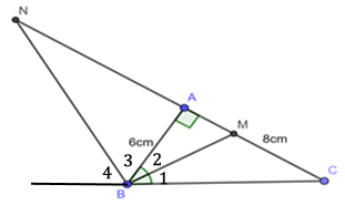 Cho tam giác ABC vuông tại A có cạnh AB = 6cm và AC = 8cm. Các phân giác trong và ngoài của góc B cắt đường thẳngAC lần lượt tại M và N. Tính các đoạn thẳng AM và AN.