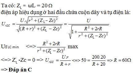 H, tụ điện có điện dung C thay đổi được mắc nối tiếp theo đúng thứ tự trên. Đặt vào hai đầu đoạn mạch một điện áp xoay chiều có giá trị hiệu dụng U = 200 V và tần số f = 50 Hz. Thay đổi C đạt tới giá trị Cm thì điện áp hiệu dụng ở hai đầu đoạn mạch chứa cuộn dây và tụ điện (U1) đạt giá trị cực tiểu bằng 50 V. Giá trị của điện trở R bằng