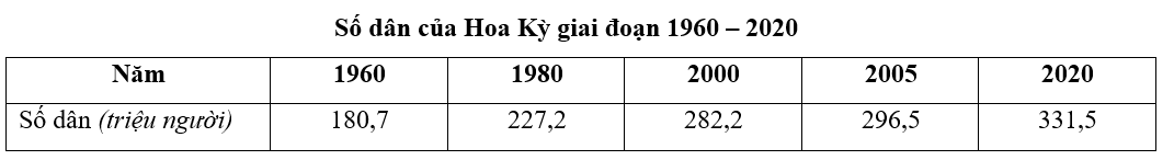 Cho bảng số liệu sau:a) Nhận xét về số dân của Hoa Kỳ trong giai đoạn 1960 – 2020.b) Nguyên