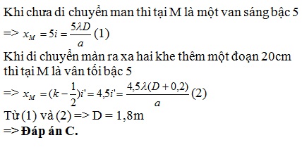 Trong thí nghiệm Y-âng về giao thoa ánh sáng, tại điểm M trên màn có vân sáng bậc 5. Di chuyển màn ra xa thêm 20 cm, tại điểm M có vân tối thứ 5. Khoảng cách từ màn quan sát đến hai khe trước khi dịch chuyển là
