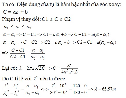 mạch chọn sóng của máy thu vô tuyển gồm cuộn dây cảm thuần L và tụ xoay gồm nhiều lá kim loại ghép cách điện với nhau, có góc quay biến thiên từ 00 (ứng với điện dung nhỏ nhất) đến 1800 (ứng với điện dung lớn nhất) khi đó bắt được sóng có bước sóng từ 10,0m đến 80,0m. Hỏi khi tụ xoay quay góc 1200 kể từ 00 thì bắt được sóng có bước sóng bằng bao nhiêu? Cho rằng độ biến thiên điện dung của tụ tỷ lệ với góc quay.
