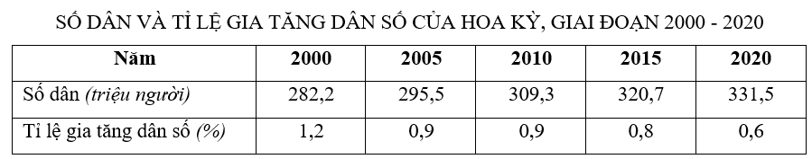 a) Dựa vào bảng số liệu và nhận xét về sự thay đổi số dân Hoa Kỳ giai đoạn 2000 - 2020.