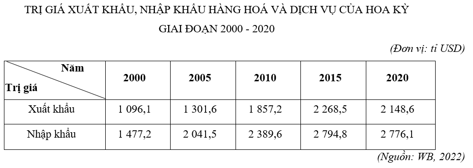 | d) Các dạng biểu đồ thích hợp thể hiện cơ cấu trị giá xuất, nhập khẩu của Hoa Kì giai đoạn 2000 – 2020 là tròn, miền, cột. |