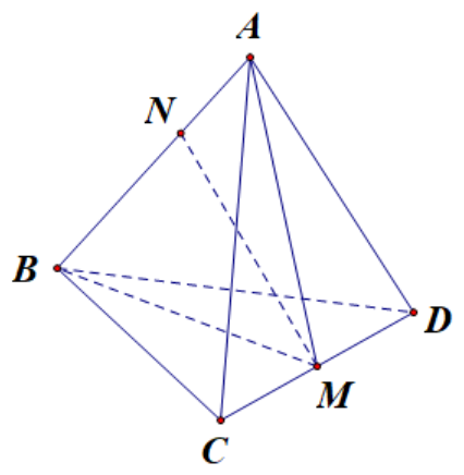 Cho tứ diện ABCD có AB = 4, $AC = AD = CD = 2\sqrt{3}$, $BC = BD = \sqrt{7}$. Tính khoảng cách giữa hai