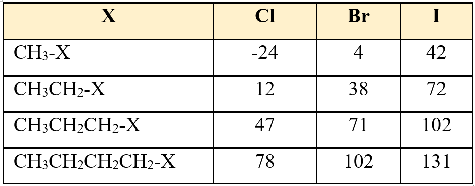 Cho nhiệt độ sôi (°C) của một số dẫn xuất halogen trong bảng dưới