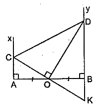 Cho đoạn thẳng $AB,\,\, O$ là trung điểm của $AB$. Trên cùng một nửa mặt phẳng bờ $AB$, vẽ các tia $Ax$ và $By$ vuông góc với $AB$. Gọi $C$ là một điểm thuộc tia $Ax$. Đường vuông góc với $OC$ tại $O$ cắt tia $By$ ở $D$. Chứng minh rằng $CD = AC + BD$
