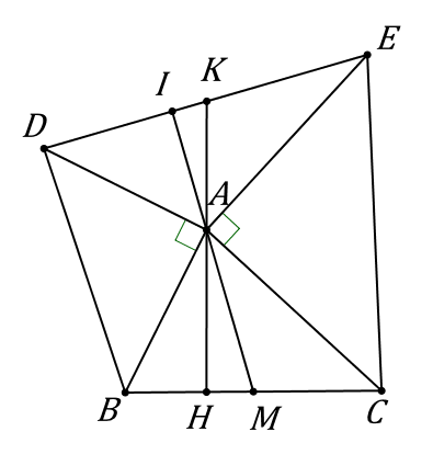 Cho tam giác $ABC$. Vẽ đoạn thẳng $AD$ bằng và vuông góc với $AB$ ($D$ và $C$ nằm khác phía đối với $AB$). Vẽ đoạn thẳng $AE$ bằng và vuông góc với $AC$ ($E$ và $B$ nằm khác phía đối với $AC$). Vẽ tia $AH$ vuông góc với $BC$. Đường thẳng $HA$ cắt $DE$ ở $K$. Chứng minh rằng $DK = KE$