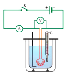 Một học sinh thực hiện thí nghiệm đo nhiệt dung riêng của nước với sơ đồ bố trí thí nghiệm như hình vẽ. Trong đó, bình nhiệt lượng kế chứa 150 g nước có nhiệt độ ban đầu là 62℃. Số chỉ vôn kế và ampe kế lần lượt là 1,6 V và 2,5 A. Sau khoảng thời gian 8 phút 55 giây thì thấy nhiệt độ của nước tăng lên 65,5℃. Bỏ qua nhiệt lượng mà bình nhiệt lượng kế và đũa khuấy thu vào. Nhiệt dung riêng của nước trong thí nghiệm này xấp xỉ bằng